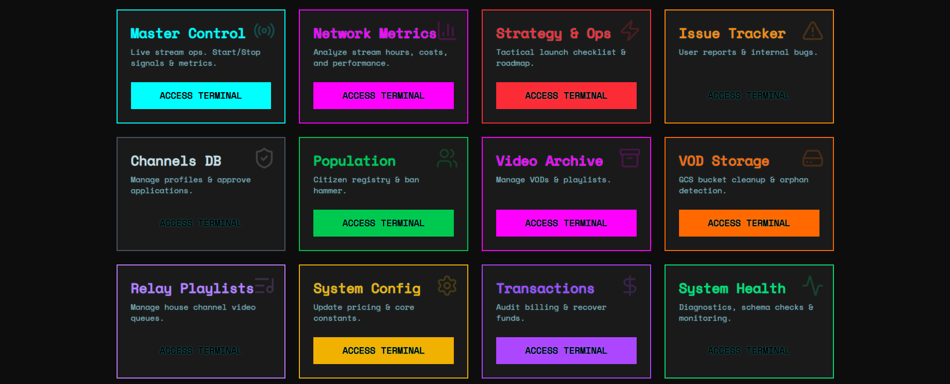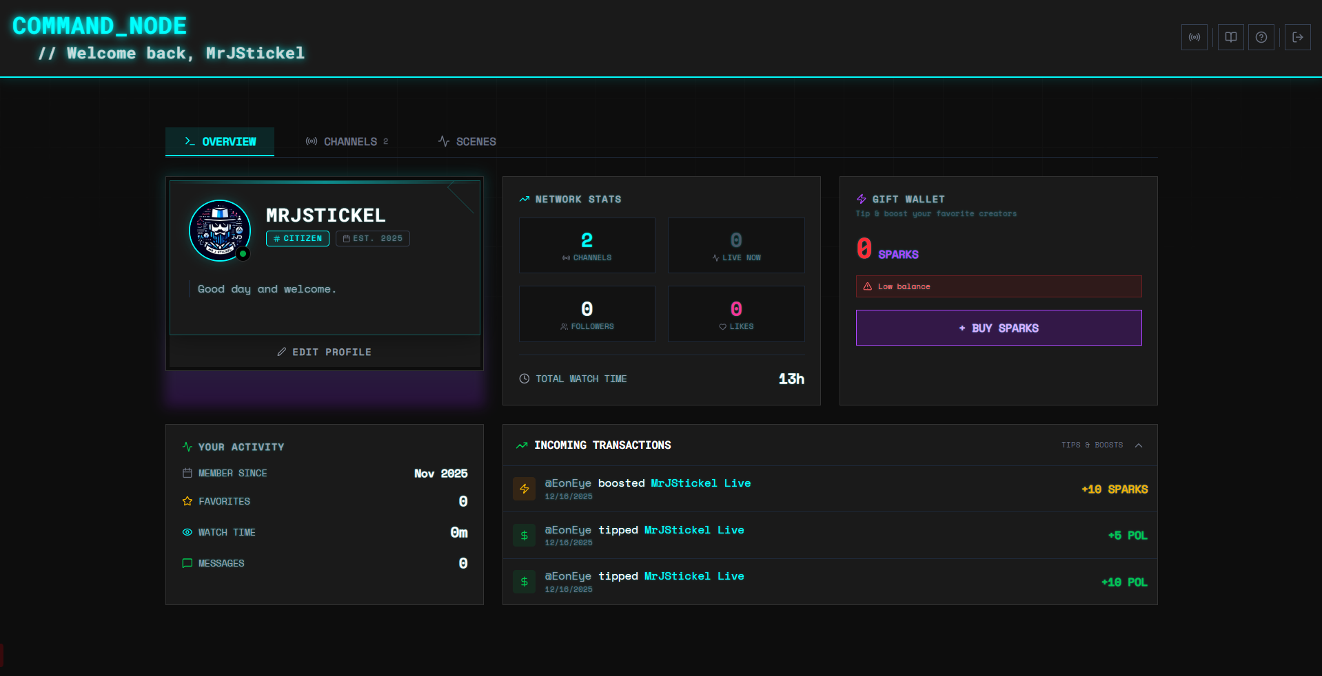 A complete streaming platform with GCP Livestream infrastructure, Polygon-based crypto payments, real-time spark economy, and multi-tier creator monetization. Serves live video 24/7 with sub-second latency.