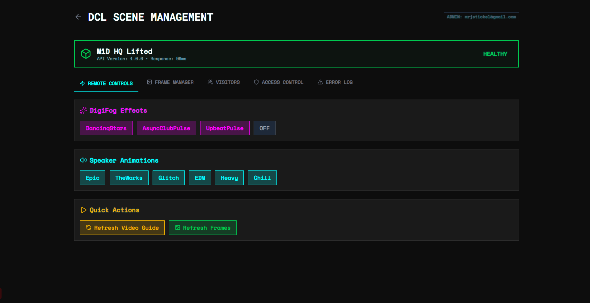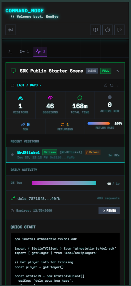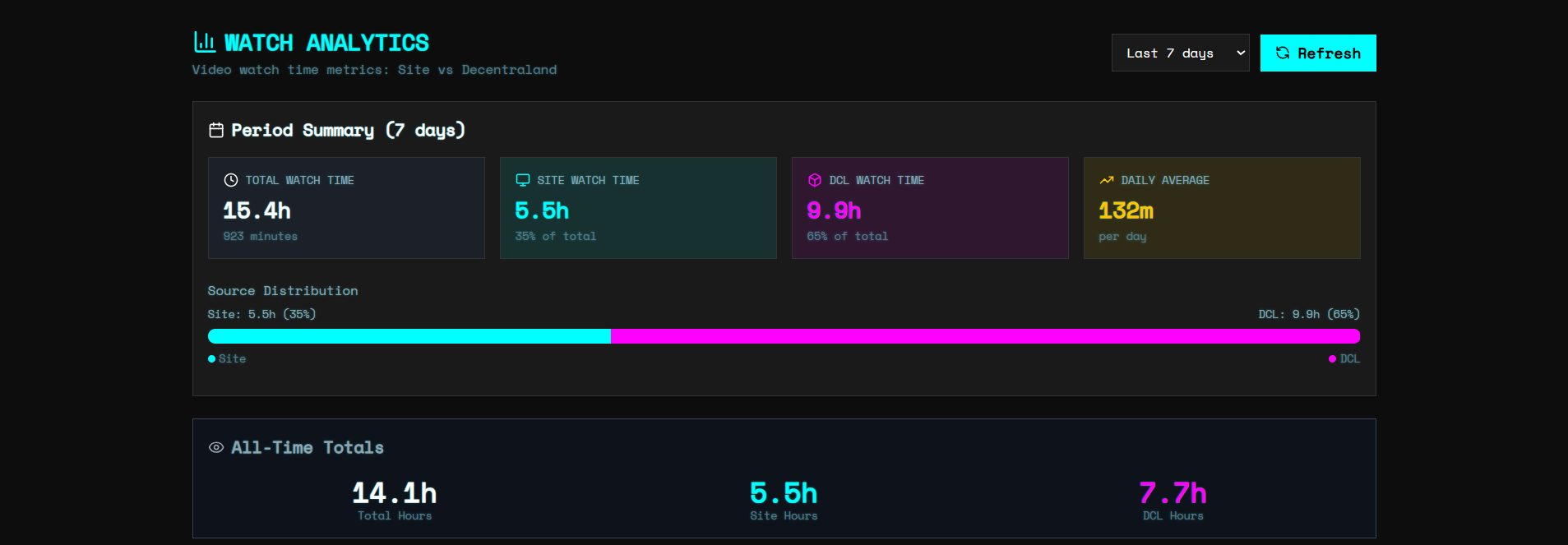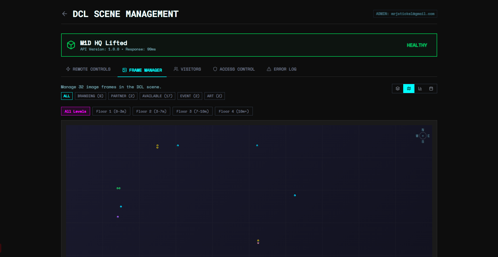 - •Decentraland SDK integration with 32-slot frame system, scene session tracking, and in-world stream playback