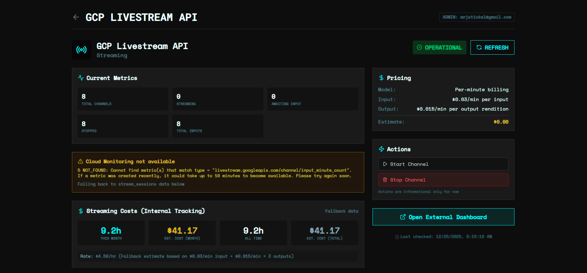 - •Admin dashboard with 30+ endpoints: economy monitoring, billing recovery, user management, stream controls