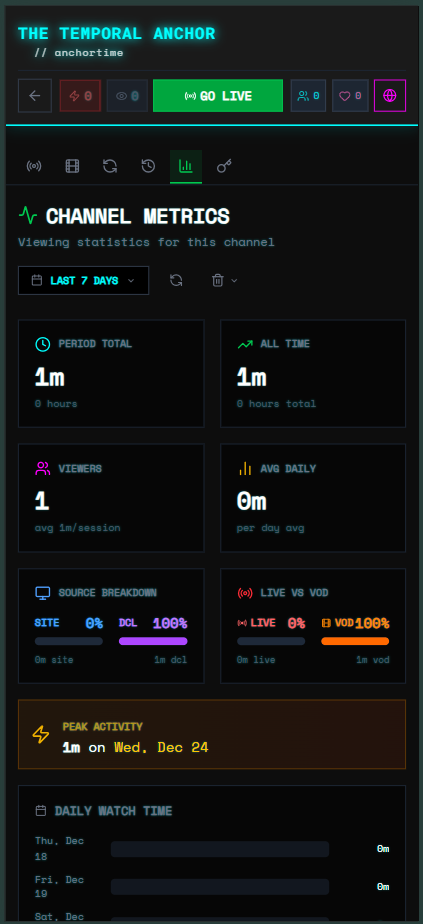 - •Real-time viewer tracking via 60s heartbeat system with privacy-preserving IP hashing for anonymous users